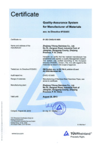 公司嚴格按ISO9001:2015《質(zhì)量管理體系—要求》、ISO14001:2015《環(huán)境管理體系 要求及使用指南》、ISO 45001:2018《職業(yè)健康管理體系 要求及使用指南》和TSG 07—2019《特種設備生產(chǎn)和充裝單位許可規(guī)則》,建立完善的管理體系。公司擁有國內(nèi)較大的12000KN冷拔機組和先進的全溫控不銹鋼固溶退火爐等生產(chǎn)設備,同時具有ET16-159渦流探傷儀、UT16-159超聲波探傷儀、UT159-830超聲波探傷儀、H159-630水壓試驗機、WAD—600液壓材料試驗機、4XB電腦金相顯微鏡、JQ—300沖擊試驗機、HBRVU—187.5硬度計、島津光譜儀、化學分析儀、晶間腐蝕試驗等完善的檢測設備。